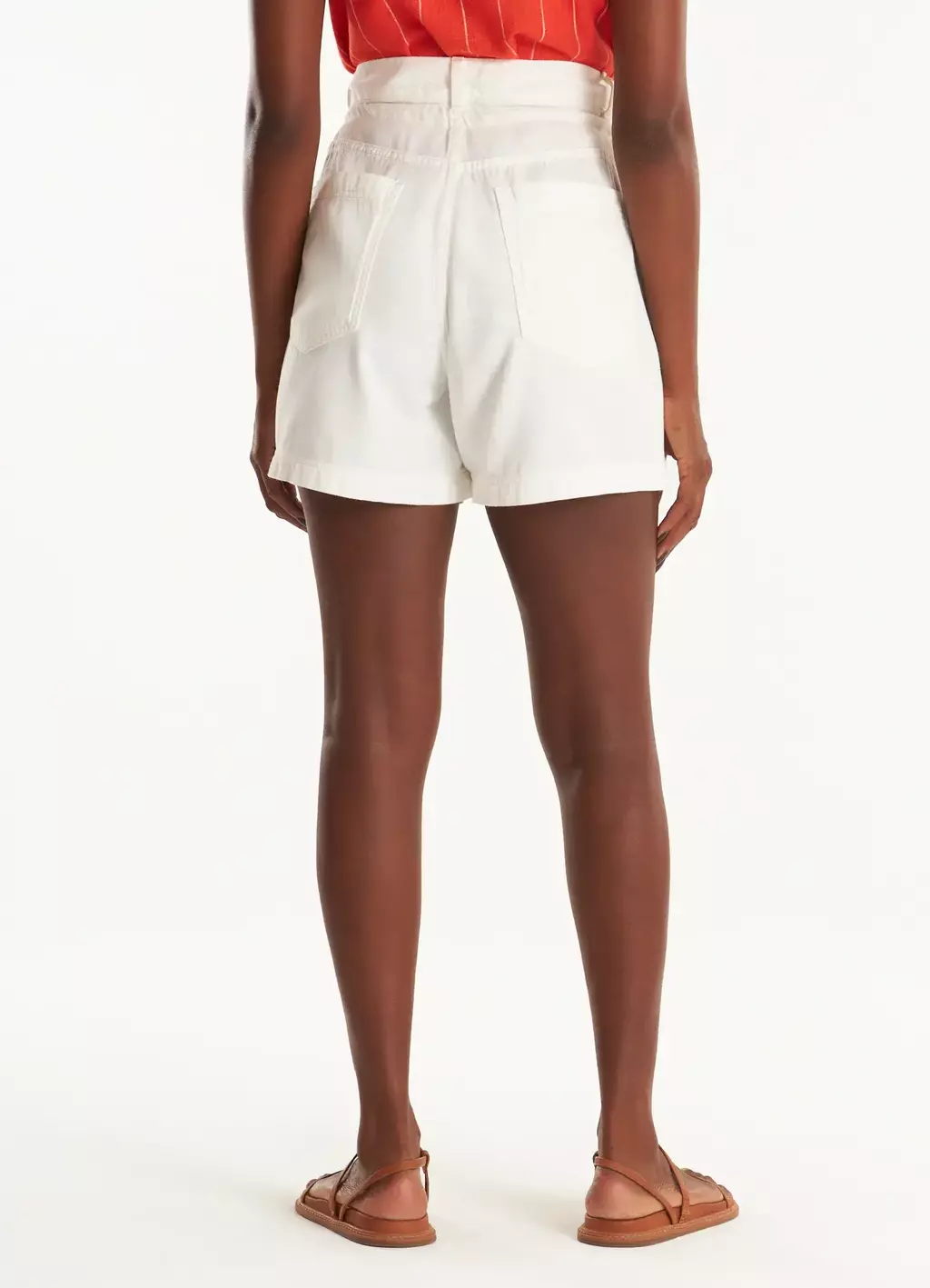 Confeccionada em sarja, esta bermuda une conforto, estilo e durabilidade. Possui cintura alta, que valoriza a silhueta e proporciona um caimento elegante, e comprimento médio, ideal para ocasiões casuais ou mais sofisticadas. O cadarço para amarração no cós não só permite um ajuste personalizado, mas também acrescenta um detalhe moderno e funcional à peça. A bermuda conta com bolsos frontais e traseiros, garantindo praticidade.