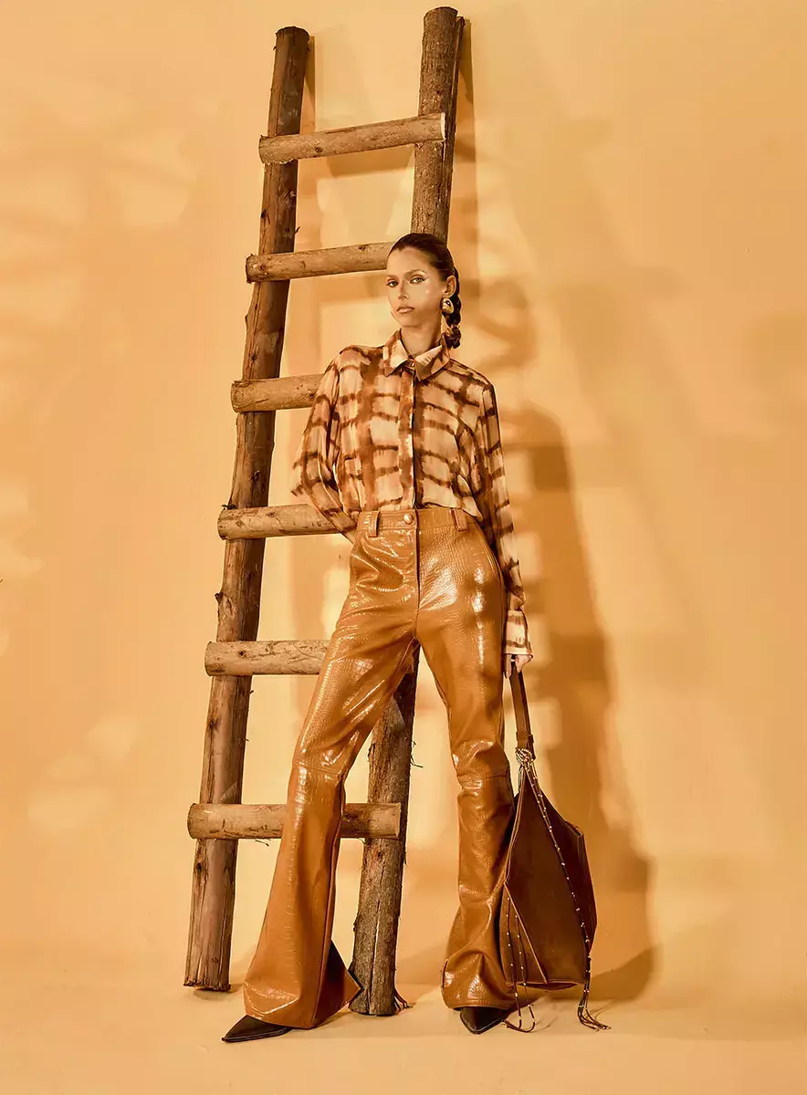 Calça: Modelagem flare, corte reto, comprimento tradicional, bolsos frontais, cintura alta, detalhe de fendas laterais, acabamento texturizado com efeito de couro de crocodilo.