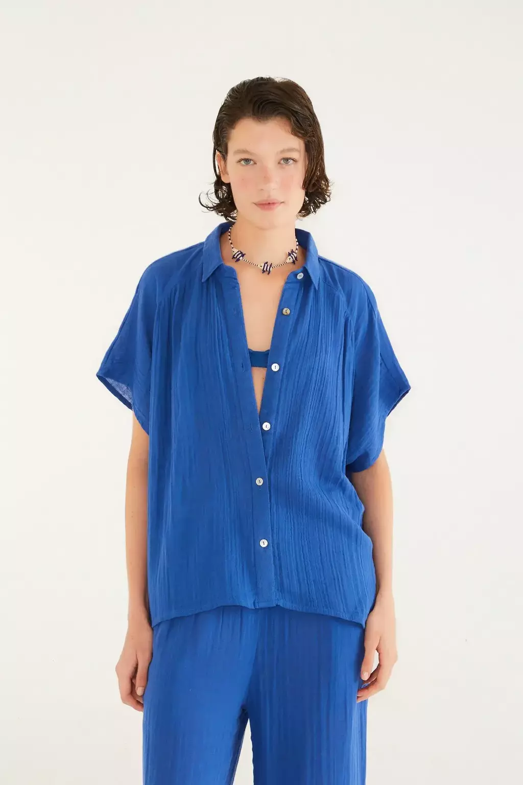 camisa prega crinkle. confeccionada em tecido leve e fluido, possui corte solto que proporciona conforto. destaque para as pregas delicadas e o fechamento frontal com botões. mangas curtas e gola clássica adicionam um toque casual. perfeita para combinações com calças ou saias em dias ensolarados. FARM RIO original - alto verão 26.