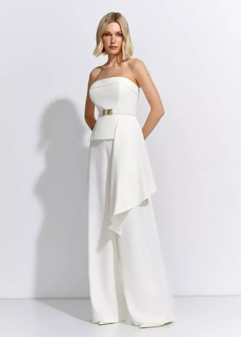 Clássico e atemporal, o conjunto off-white exala sofisticação em cada detalhe. A blusa estruturada com recortes verticais garante firmeza e charme, enquanto a calça com bolso faca e barra ampla cria uma silhueta alongada e elegante. Perfeito para casamentos civis, formaturas ou eventos especiais em ambientes iluminados. Combine com sandália metalizada, brincos delicados e uma clutch rígida em acrílico leitoso para um visual impecável.