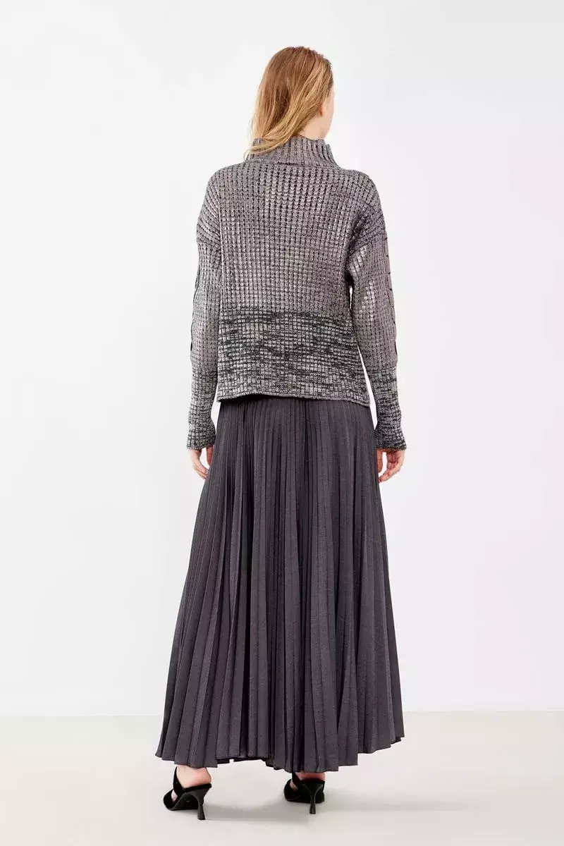 A Saia Tecido Plissada exala elegância e proporciona conforto, sendo a escolha ideal para diversas ocasiões. Com comprimento longo, apresenta um shape solto, barra ampla e cós alto com destaque contrastante.